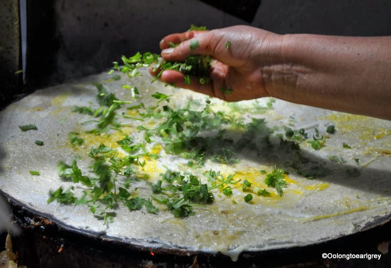 A thin layer of batter is expertly swirled onto the hot iron griddle, quickly followed by an egg which is spread over the thin, crispy pancake.